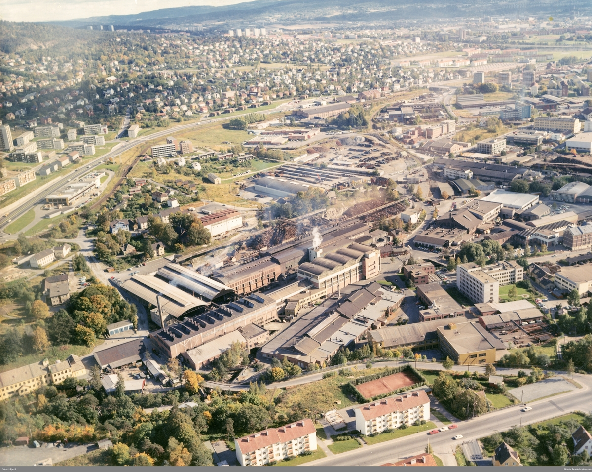 Dette flyfoto fra 1965 er tatt mot sørøst viser hvor stort Spigerverket var. Nederst i bildet Maridalsveien, øverst på tvers gjennom bildet Ring 3.